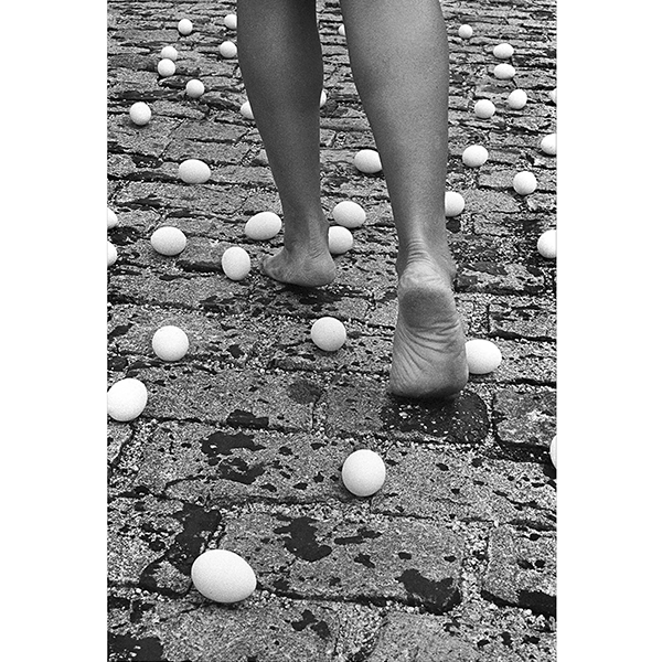A criação original desta instalação de Anna Maria Maiolino (1942) ocorre no contexto do fim da ditadura militar no Brasil e do retorno à democracia. Em uma rua do Rio de Janeiro, a artista convidou o público a participar de uma corrida de obstáculos com centenas de ovos, para que pudessem experimentar o risco e a incerteza e, ao mesmo tempo, projetar as possibilidades de um renascimento. Um tríptico fotográfico em preto e branco que retrata as panturrilhas e as solas dos pés da artista caminhando por uma rua de paralelepípedos é o que ficou documentado dessa performance.